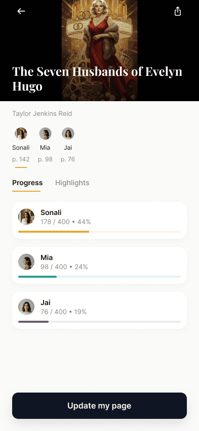 Shared progress tracking — Everyone's page count is visible at a glance. No need to ask where anyone is.