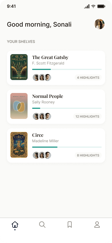 Shelf gives 2–5 friends reading the same book a private, dedicated space to stay connected as they read, not just at a scheduled meeting. Drop highlights as you go, see where everyone is, react to what catches their eye. The conversation happens in the margins, asynchronously, at whatever pace works.