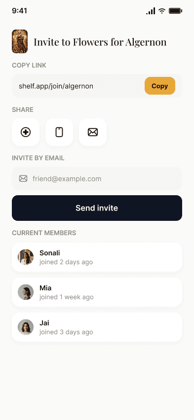 Private shelves — One shelf per book, invite only. Everyone else stays out.